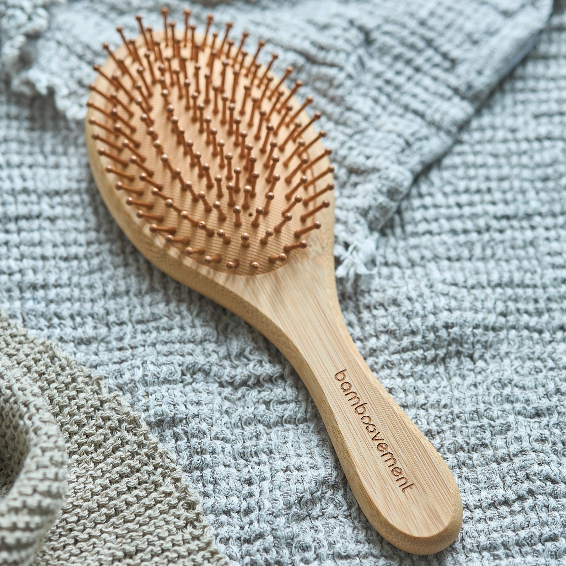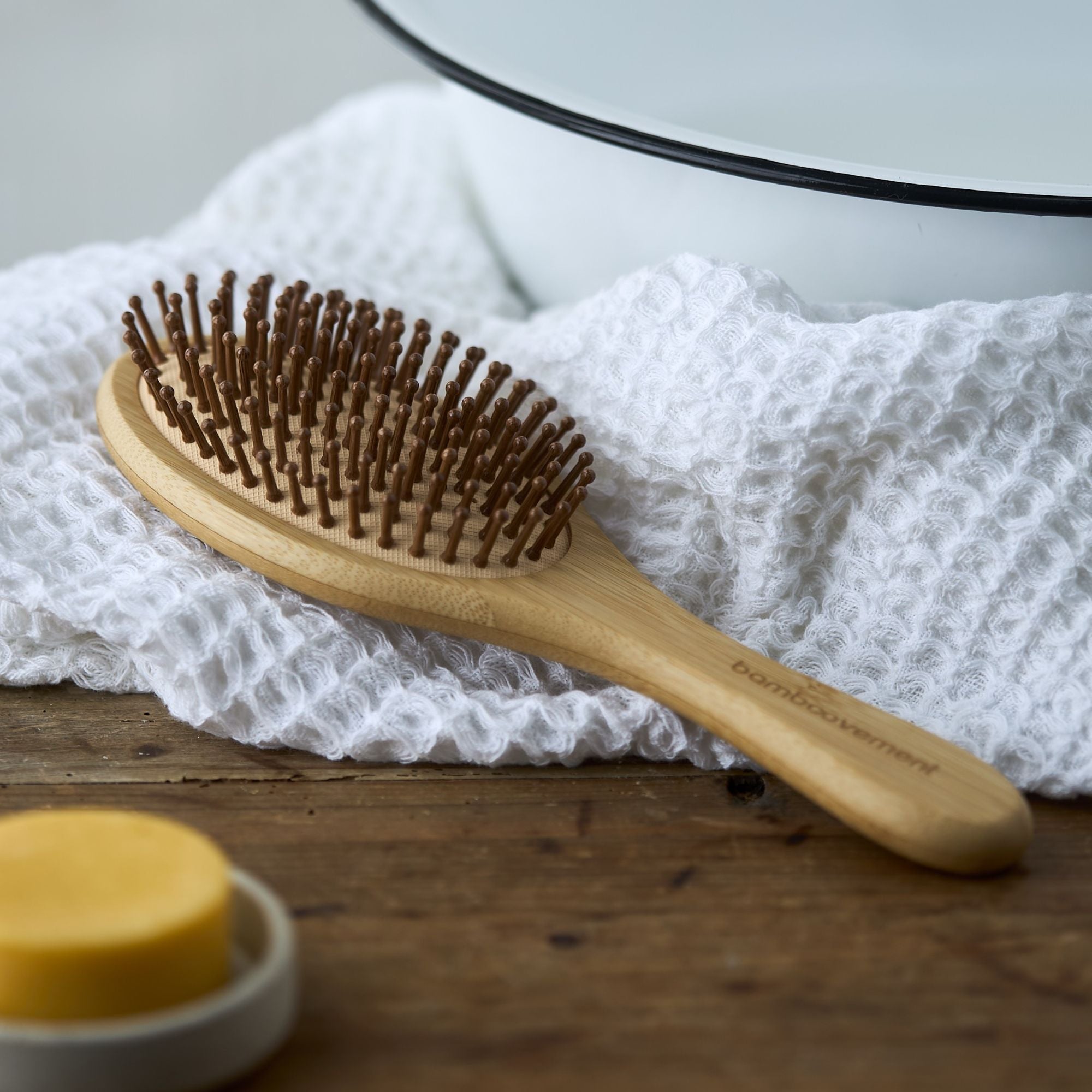Med denne brede bambus hårbørste fra Bamboovement får du et naturligt redskab, der er skånsomt mod både hår og hovedbund. De afrundede bambuspigge er antistatiske og glider let gennem håret uden at knække eller rive, samtidig med at de giver en blid massage af hovedbunden, som øger blodcirkulationen og kan fremme sund hårvækst.
