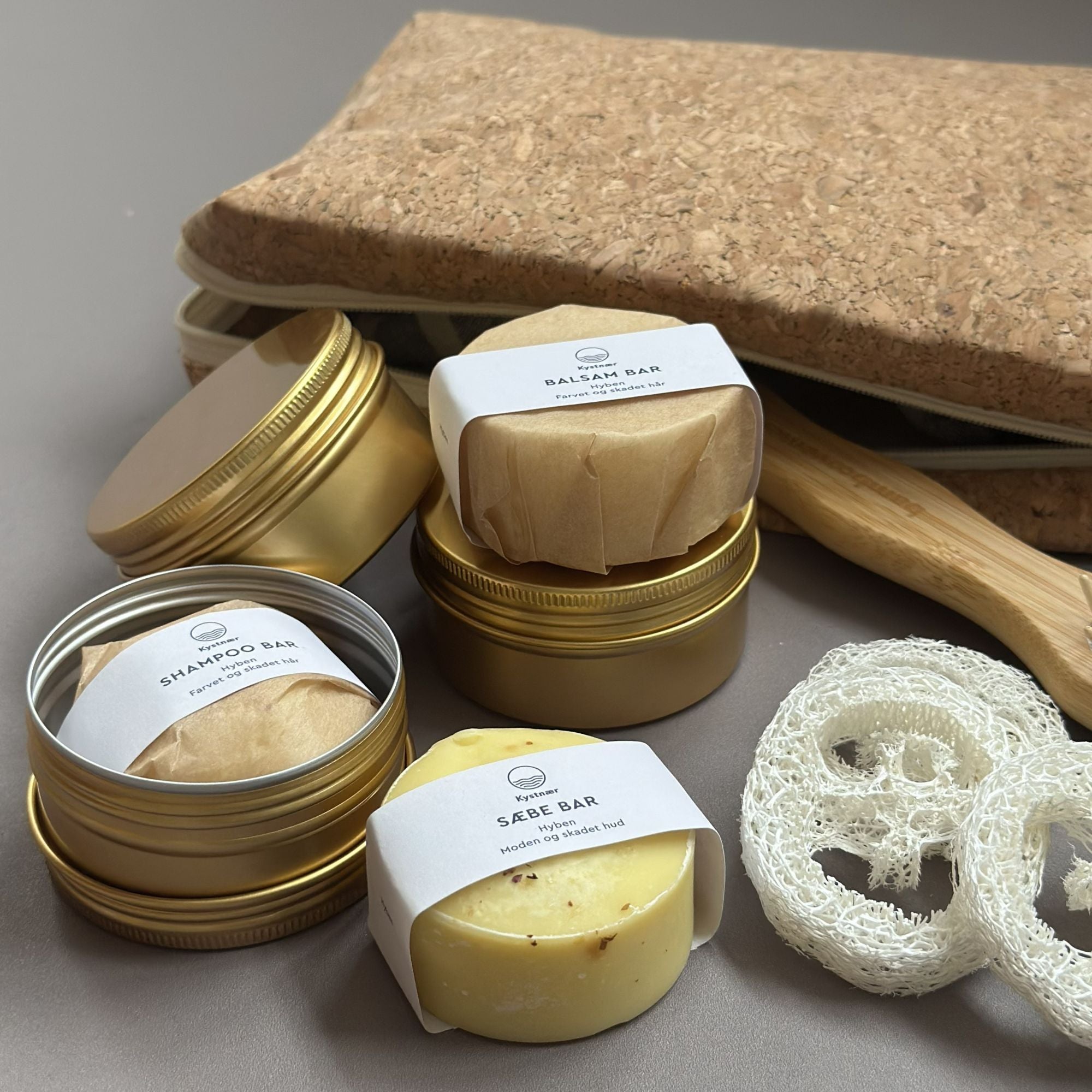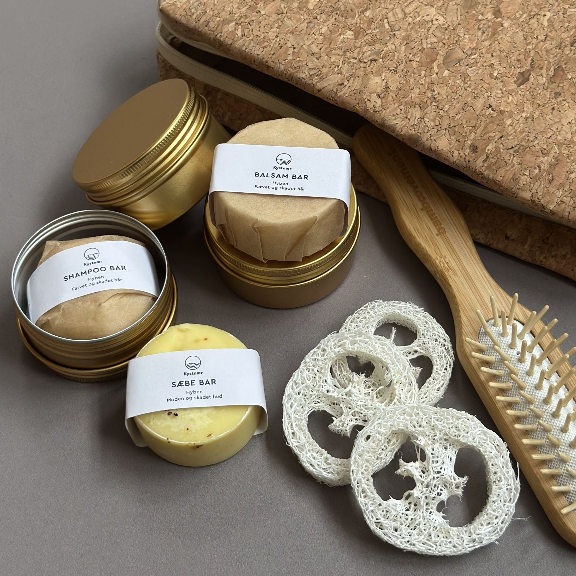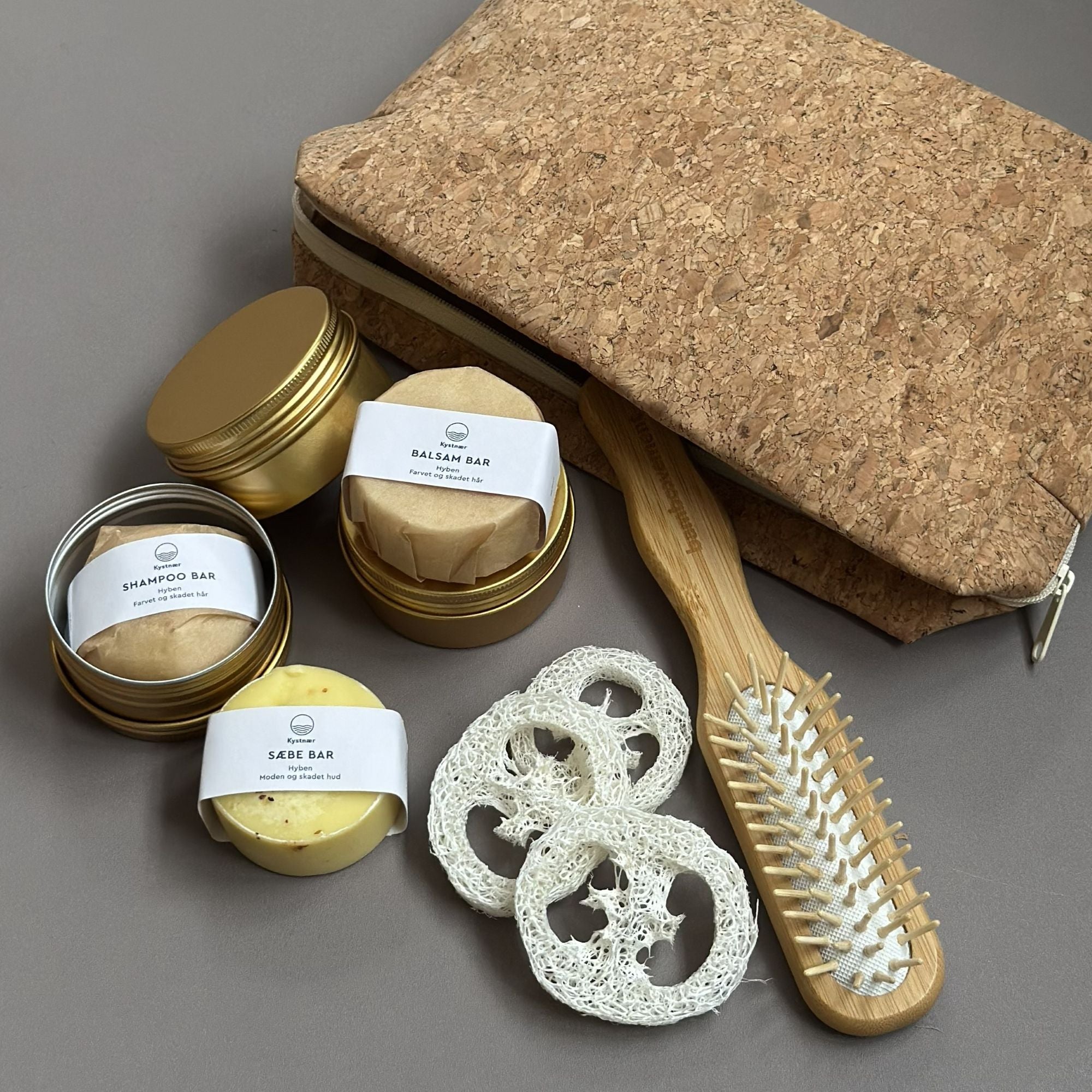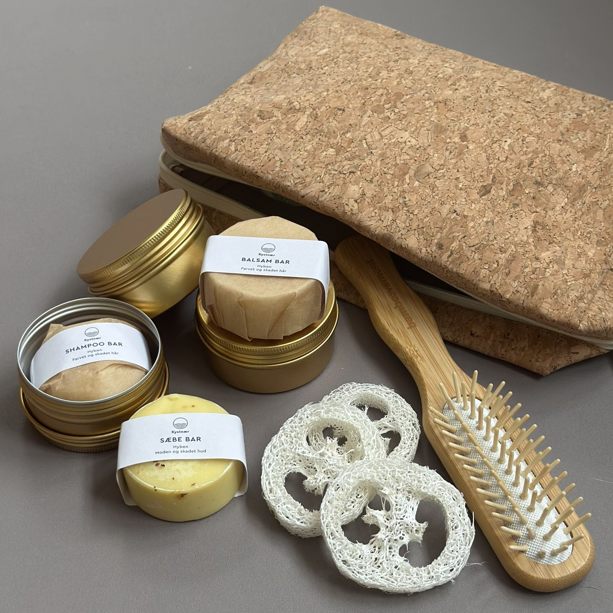Ønsker du at tage din naturlige plejerutine med dig, uanset hvor du er? Rejsepakken med hyben samler alt, du behøver til en genopbyggende og plejende hår- og hudplejerutine i en smuk, funktionel toilettaske i kork.