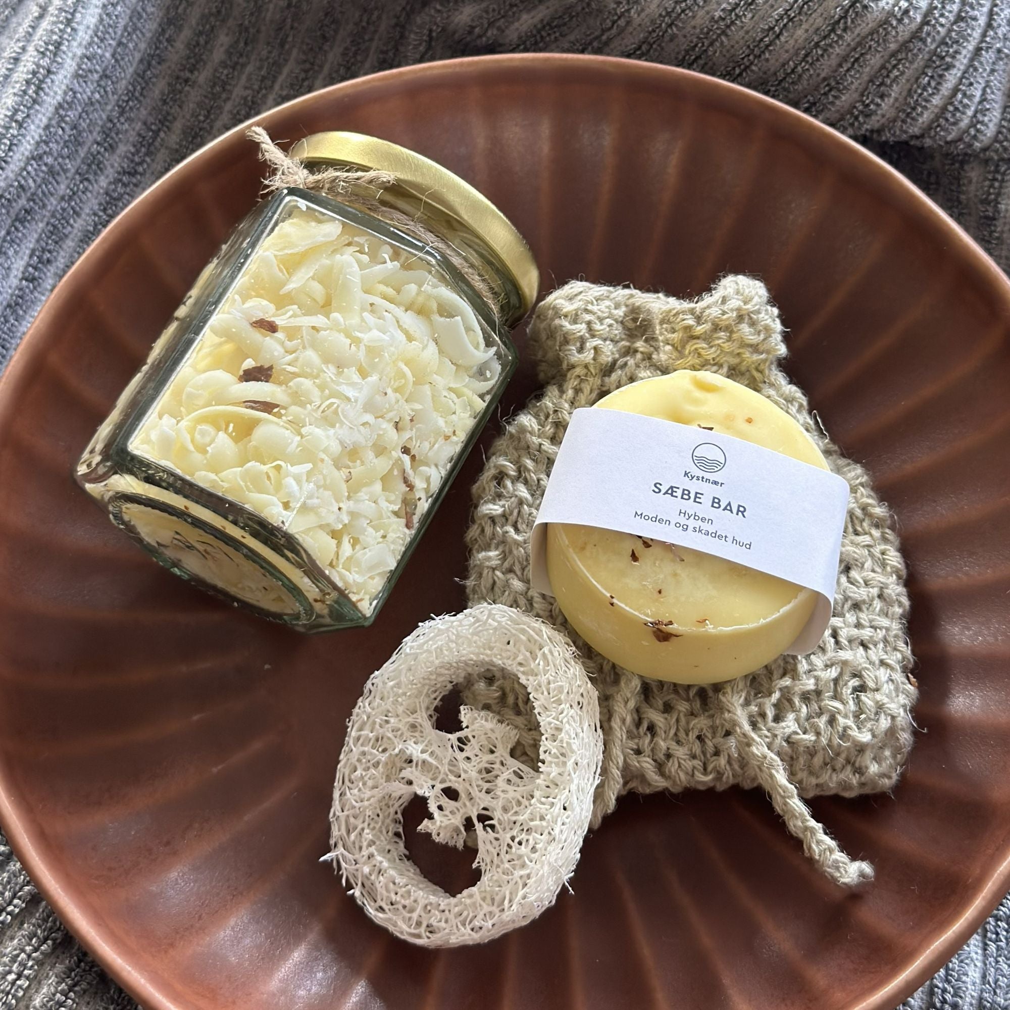 Pakken samler alt, du behøver for en stund af selvforkælelse, hvor huden efterlades blød, frisk og ren. Hvert produkt er håndlavet med naturlige ingredienser, der nærer huden og giver en følelse af velvære.