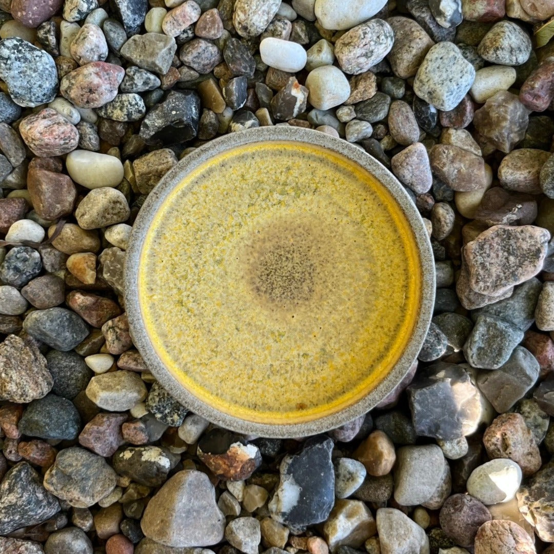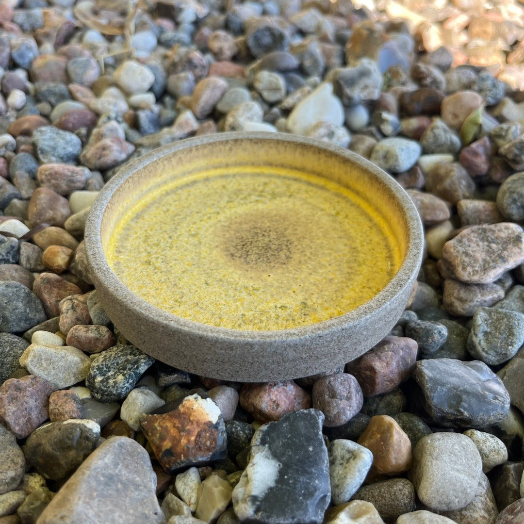Diese schöne und einzigartige Keramik -Seifenschale mit klassischer, niedriger Kante ist in dunklem Ton geformt und mit Gelb glasiert.