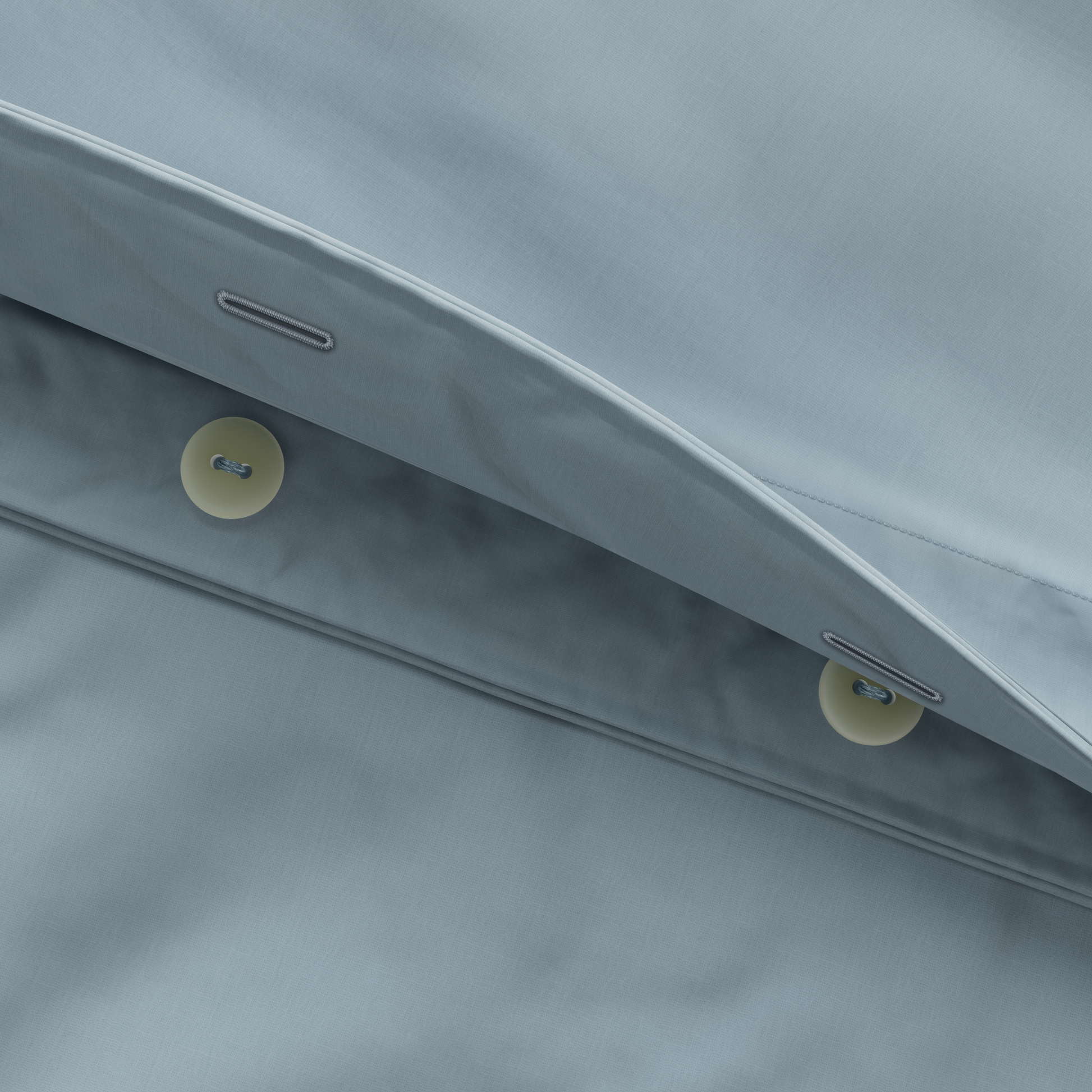 Sengetøjet er satinvævet af 81 % økologisk bomuld og 19 % genanvendt bomuld – en kombination, der giver et let, blødt og slidstærkt udtryk. Den afdæmpede blå nuance leder tankerne hen på havets lyse toner, når solen rammer vandet – en farve, der indbyder til ro og balance i soveværelset.